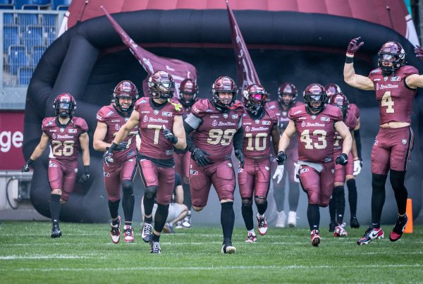Gegen 15:00 Uhr war es dann soweit: Im Stadion ging es richtig los. Eine Schülergruppe trug einen „Football is Family“-Banner auf das Spielfeld, bevor Stuttgart Surge samt Fahne von Baden-Württemberg und Stadtwappen reinstürmte. Als dann Rhein Fire aus dem überdimensionalen Football-Helm in den Innenraum kam, bebte die ausverkaufte Hütte so richtig, die eindeutig in der Hand der Fire-Fans war.